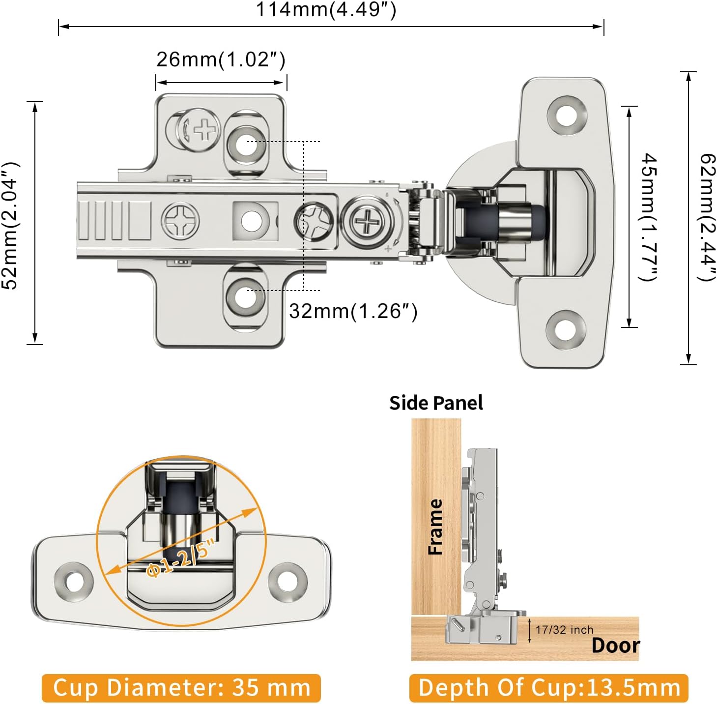 • Easy Installation: Features a 13.5mm cup depth, 45mm screw hole spacing, and fits door thicknesses of 14-22mm, making it compatible with a wide range of cabinet door styles. This European-style, concealed hinge is designed for full overlay doors on frameless cabinets. Each set includes 2 dowels, 4 self-tapping screws, and 2 screw covers for a seamless finish.